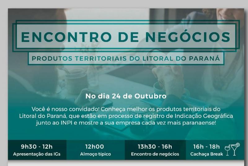 No dia 24 de outubro, próxima terça-feira, acontecerá no Camboa Hotel, o Encontro de Negócios – Produtos Territoriais do Litoral do Paraná. O evento é realizado pelo Serviço Brasileiro de Apoio as Micro e Pequenas Empresas (Sebrae) e Agência de Desenvolvimento do Turismo Sustentável do Litoral do Paraná (Adetur) e conta com o apoio da Secretaria Municipal de Cultura e Turismo de Paranaguá.