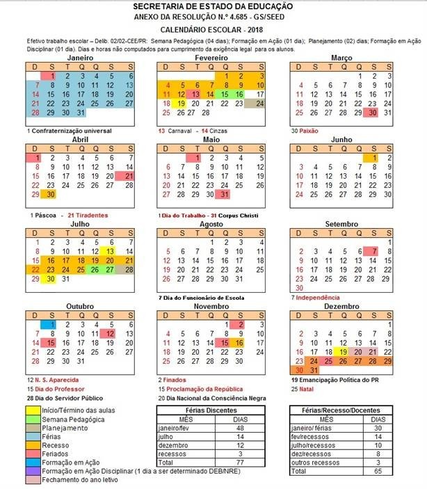 O ano letivo de 2018 começa no dia 19 de fevereiro para um milhão de alunos matriculados na rede estadual de ensino do Paraná. Os 100 mil profissionais das escolas retornam um pouco antes, para participar da Semana Pedagógica nos dias 15 e 16 de fevereiro. Outras atividades de planejamento e formação também estão programadas.
