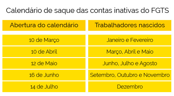 Quem nasceu em março, abril e maio vai sacar entre 10 de abril e 11 de maio. Trabalhadores nascidos nos meses de junho, julho e agosto vão sacar entre os dias 12 de maio e 15 de junho. Nascidos em setembro, outubro e novembro vão receber os valores em entre 16 de junho e 13 de julho. Os trabalhadores nascidos em dezembro vão fazer o saque entre os dias 14 e 31 de julho.