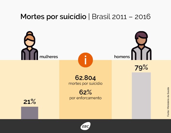 Cerca de 11 mil pessoas morrem por suicídio todos os anos no Brasil. De acordo com o primeiro boletim epidemiológico sobre suicídio, divulgado hoje (21) pelo Ministério da Saúde, entre 2011 e 2016, 62.804 pessoas tiraram suas próprias vidas no país, 79% delas são homens e 21% são mulheres. A divulgação faz parte das ações do Setembro Amarelo, mês dedicado à prevenção ao suicídio.