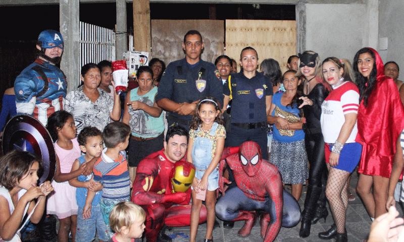 A Liga da Justiça por meio dos voluntários com vestimentas de super heróis dos quadrinhos e do cinema, fez a entrega dos presentes. “O serviço preventivo que realizamos no Dead tem um trabalho essencial e também aproxima o Poder Público da comunidade, uma marca da gestão do prefeito Marcelo Roque”, ressalta GCM Freitas.