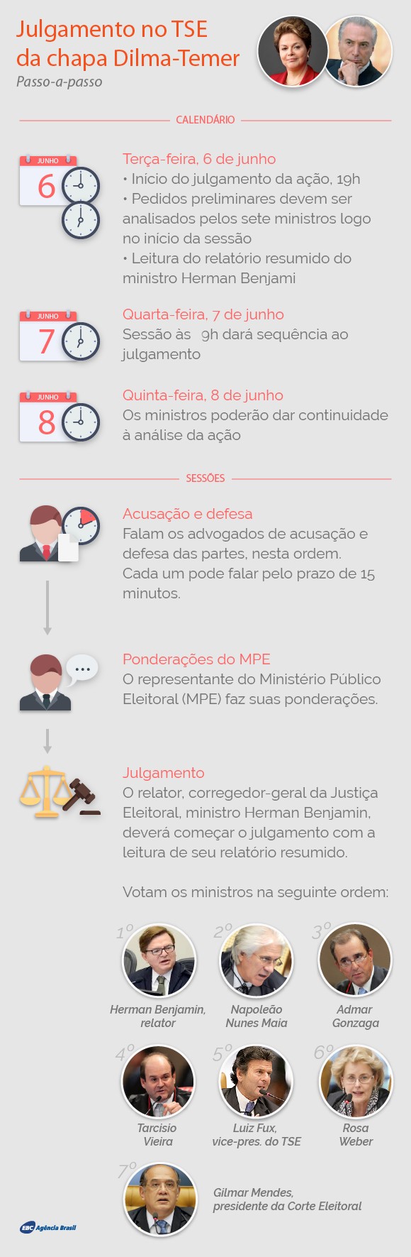 O presidente do TSE, Gilmar Mendes, marcou quatro sessões para analisar o processo, nos dias 6, 7 e 8 de junho. Na ação, o PSDB pede a cassação da chapa que disputou e venceu as eleições presidenciais de 2014, alegando que há irregularidades na prestação de contas.