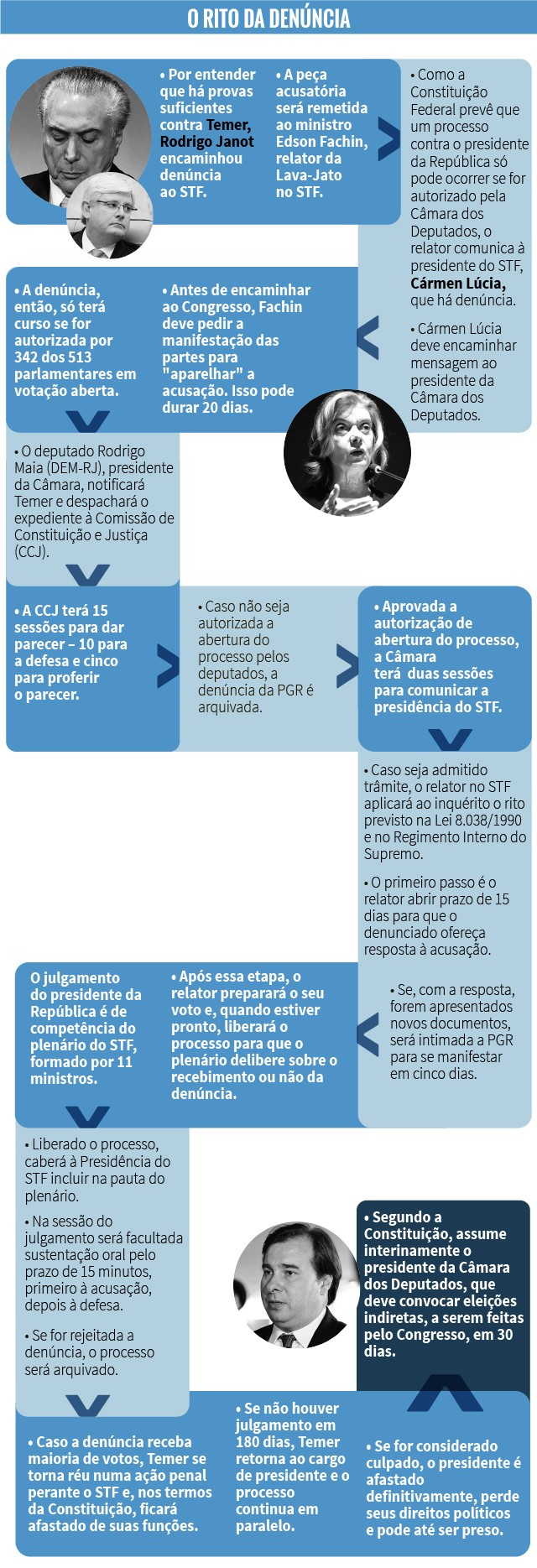 Pela primeira vez em sua história, o Brasil tem um presidente da República denunciado por corrupção no exercício do mandato. Na noite desta segunda-feira (26), o procurador-geral da República, Rodrigo Janot, apresentou ao Supremo Tribunal Federal (STF) denúncia contra Michel Temer, acusado pelo crime de corrupção passiva, a partir de investigação aberta com a delação da JBS. Agora, o peemedebista concentra suas atenções na Câmara, onde precisará do apoio de 172 dos 513 deputados para arquivar a denúncia e evitar a possível perda do cargo.