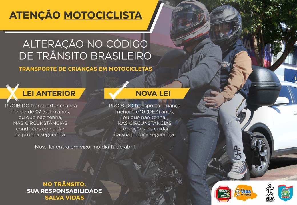 Quem tem motocicleta podia levar uma criança como passageiro com idade a partir dos 7 anos, mas a Lei 14071/20, do Código de Trânsito Brasileiro, mudou a faixa etária para 10 anos.