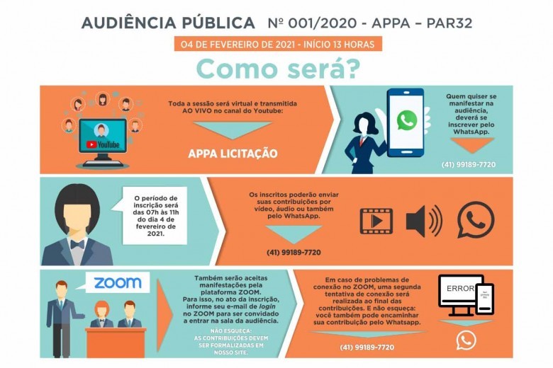 Os interessados em se manifestar devem fazer a inscrição pelo WhastApp (41) 99189-7720, das 7h às 11h. A contribuição poderá ser feita por mensagem de vídeo, áudio, texto ou pela plataforma Zoom. Neste último caso, é necessário, no ato de inscrição, encaminhar o endereço eletrônico de login no Zoom, para ser convidado a entrar na sala.
