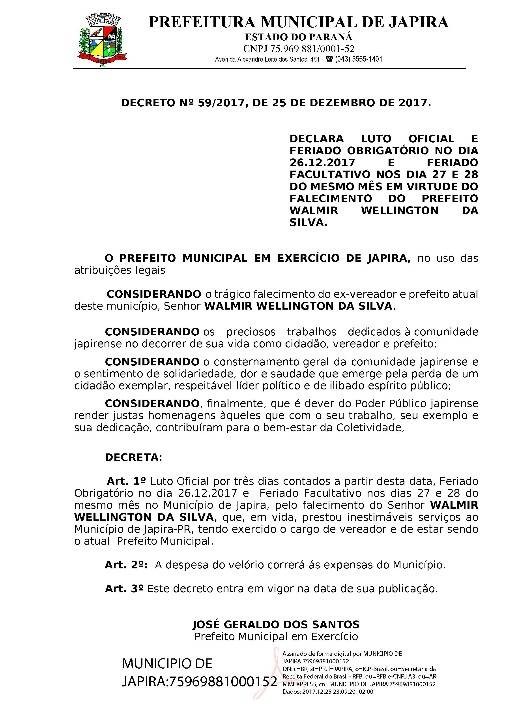 Três dias de luto oficial foram decretados em Japira pela morte do prefeito Walmir Wellington da Silva, de 48 anos e de sua enteada, de apenas 4 anos. Eles morreram no fim da tarde de segunda-feira (25), em um acidente registrado na BR-153, na altura do quilômetro 94, em Japira.