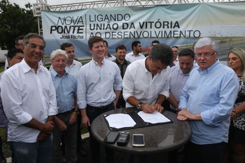 O governador Beto Richa assinou neste sábado (31) a ordem de serviço para o início da construção da nova ponte sobre o Rio Iguaçu, em União da Vitória, região Sul do Paraná. A licitação da obra indicava um orçamento de R$ 32,98 milhões e a empresa vencedora fará a ponte por R$ 24,5 milhões (desconto de 23%). O investimento será feito com recursos do Governo do Estado.