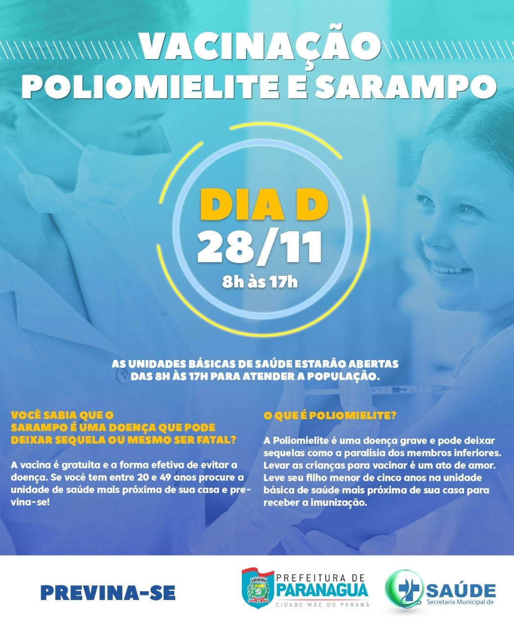 No próximo sábado, 28, as unidades básicas de saúde estarão abertas das 8h às 17h para aplicação de vacinas contra a Poliomielite e o Sarampo. A população também poderá aproveitar a oportunidade para colocar em dias suas carteiras de vacinação, também por isso é importante levar a caderneta para que as equipes verifiquem as vacinas que faltam serem aplicadas.