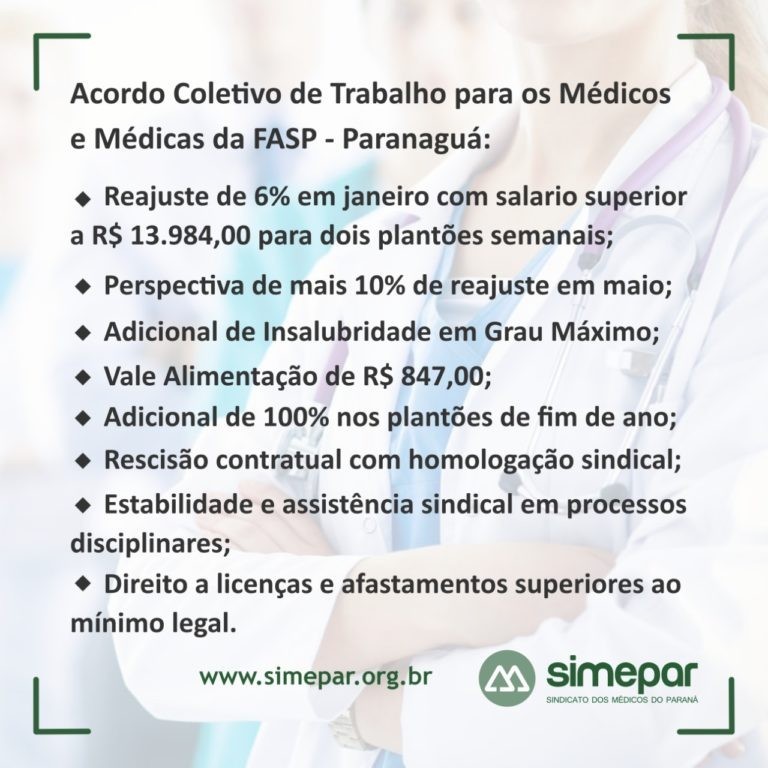 O Sindicado dos Médicos no Estado do Paraná (Simepar) está firmando um Acordo Coletivo de Trabalho com a Fundação de Assistência à Saúde de Paranaguá (FASP) com o reajuste de 6% nos salários dos médicos e médicas já neste mês de janeiro; e a perspectiva de mais 10% em maio deste ano.