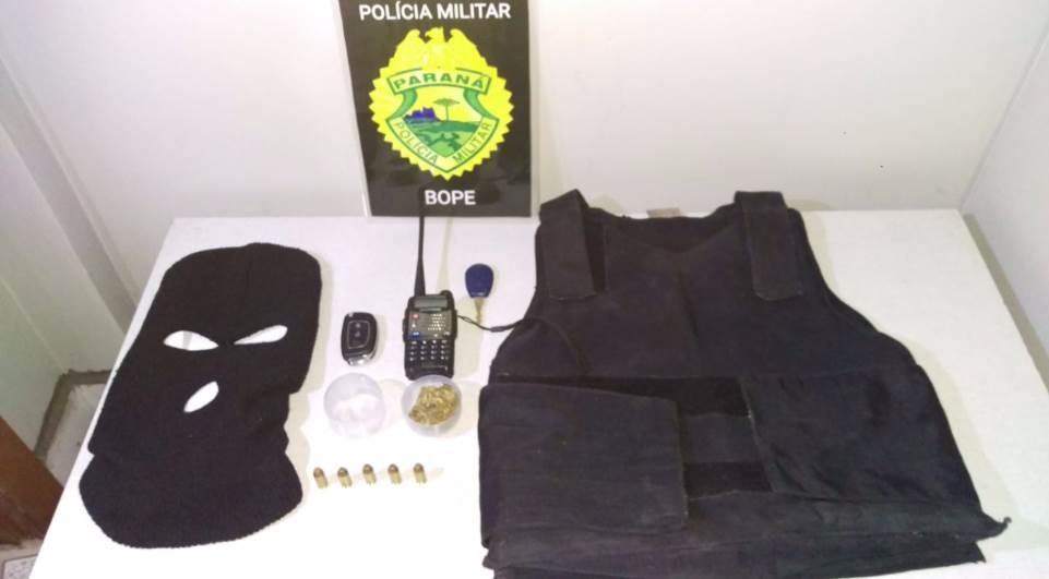 No mesmo local foram encontrados um rádio comunicador na frequência da Polícia Militar, cinco munições calibre .40, uma touca que cobre o rosto e um colete balístico.