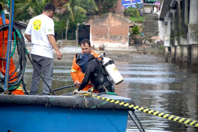 Dia de outono, mas com clima de inverno, mergulhadores iniciaram a vistoria na fundação subaquática da passarela. De acordo com o secretário de Obras, Maikol Nascimento do Amarante, será feito reforço das estacas de fundação, num trabalho subaquático, e ainda a recuperação do contrapiso da laje, além da limpeza de toda a passarela e pintura.