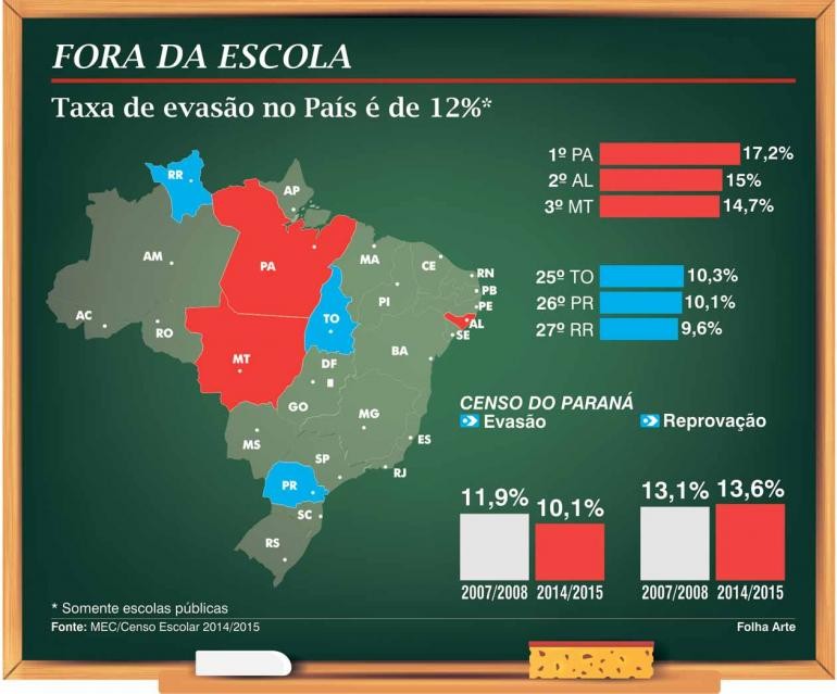 Para calcular os indicadores de fluxo escolar, o Inep e o Ministério da Educação (MEC) consideraram os dados obtidos por meio do Censo Escolar. Entre 2014 e 2015, o Paraná foi o segundo Estado com menor índice de evasão escolar no ensino médio: 10,1%. No entanto, o cenário é praticamente o mesmo de 2007 e 2008, quando 11,9% dos alunos interromperam os estudos. A reprovação também se manteve constante. Apenas as taxas foram divulgadas pelo MEC; os números absolutos não foram revelados. (Veja infográfico)