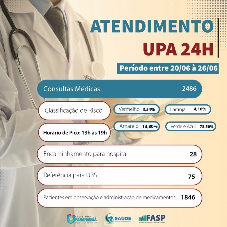 A Fundação de Assistência à Saúde de Paranaguá (Fasp), divulgou seu primeiro boletim semanal de atendimentos na Unidade de Pronto Atendimento (UPA) que corresponde aos dias 20 a 26 de junho.
