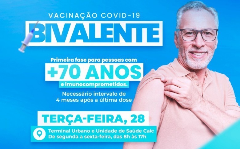 Nesta terça-feira, 28, será iniciada a imunização contra a Covid-19 Com as vacinas bivalentes Pfizer. Nesta primeira etapa do novo reforço, poderão receber a vacinação pessoas com 70 anos ou mais idade; seguidas de: pessoas vivendo em instituições de longa permanência (ILP), abrigados e os trabalhadores dessas instituições; imunocomprometidos; comunidades indígenas, ribeirinhas e quilombolas;