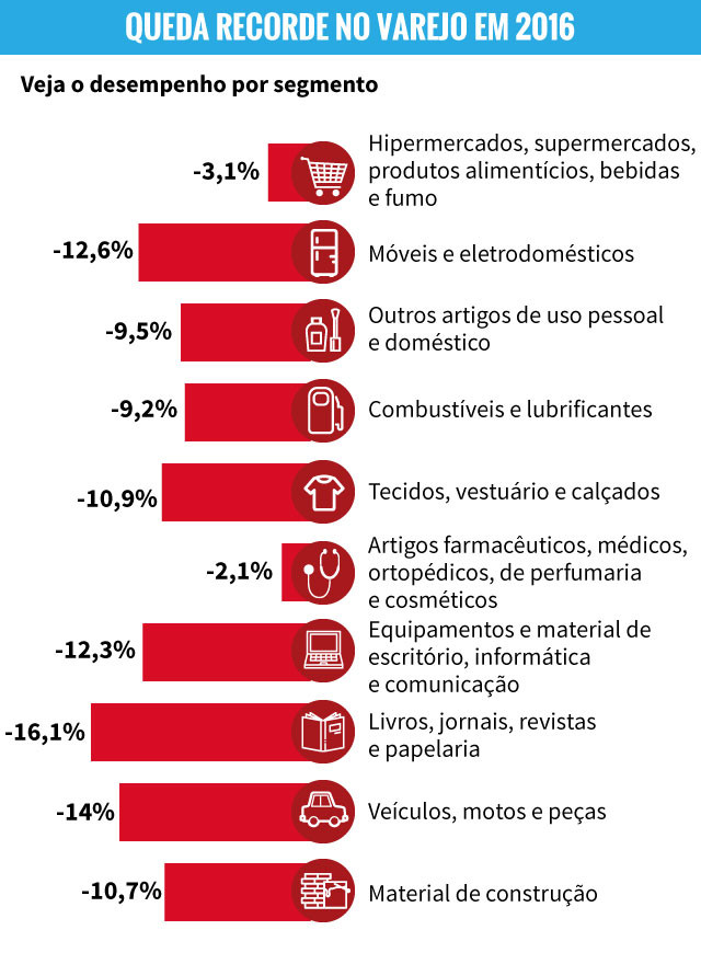 O recuo de 6,2% nas vendas do comércio varejista registrado em 2016 foi o mais acentuado da série histórica da Pesquisa Mensal de Comércio, iniciada em 2001 pelo Instituto Brasileiro de Geografia e Estatística (IBGE). Todas as atividades investigadas registraram perdas, sendo que seis delas também tiveram as quedas recordes.