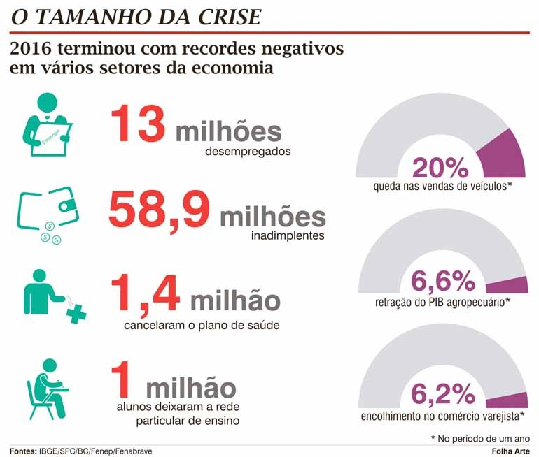 São aproximadamente 13 milhões de brasileiros que vivem o pesadelo do desemprego, um dos reflexos da pior recessão desde 1948, quando teve início a série histórica divulgada pelo Instituto Brasileiro de Geografia e Estatística (IBGE). As quedas do Produto Interno Bruto (PIB) registradas em 2015 e em 2016 somam 7,2%. O PIB representa a soma de todos os bens e serviços produzidos no País. No ano passado, houve retração nos índices relacionados à indústria, ao setor de serviços e à agropecuária. Países como a Grécia (0,3%) e a Rússia (-0,8%) obtiveram resultados melhores que o Brasil durante 2016.