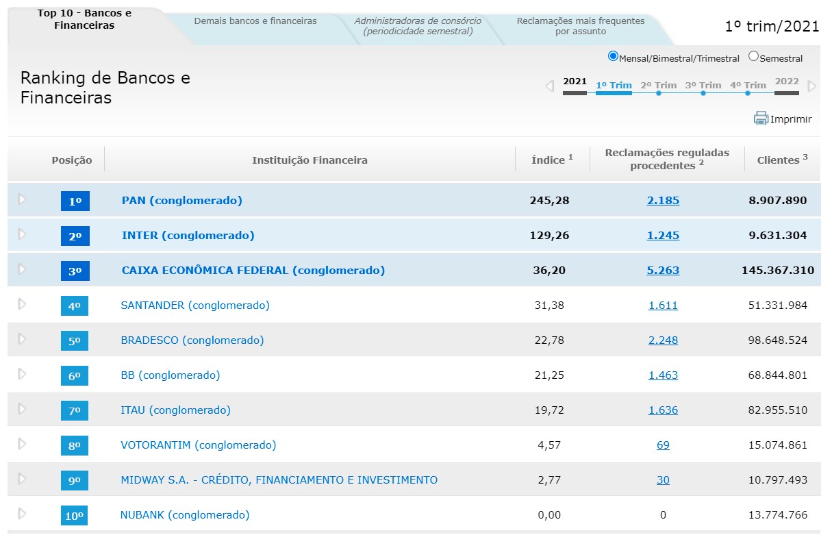 Como faz periodicamente, o Banco Central do Brasil (BCB) divulgou recentemente o seu tradicional Ranking de Reclamações, com as dez instituições bancárias com mais reclamações de clientes. Restrito ao primeiro trimestre deste ano, o “Top 10” traz em primeiro lugar o paulista Banco Pan, fundado por Silvio Santos e hoje sob controle do BTG Pactual.
