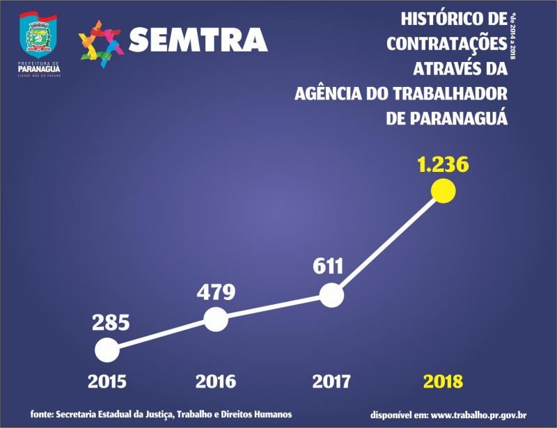 A Agência do Trabalhador de Paranaguá realizou 1.236 colocações no ano de 2018 superando os números dos últimos 3 anos. Em 2015 foram 285, em 2016 foram 479 e no início da atual gestão, em 2017, foram 611 colocações.