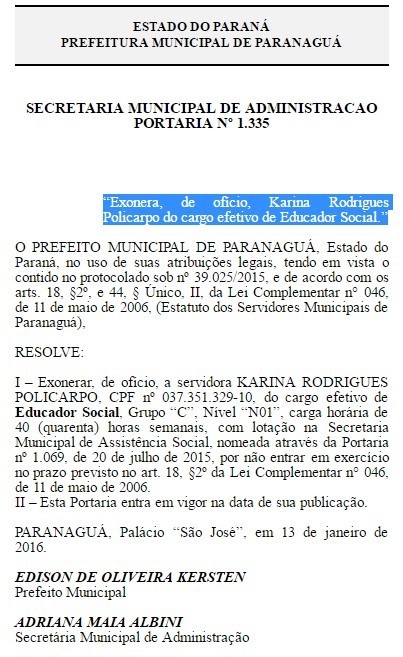 No dia 20 de julho de 2015, o prefeito Edison Kersten assinou a portaria nº 1.069, que nomeava, dentre outros, a servidora Karina Rodrigues Policarpo para o quadro de Educador Social.