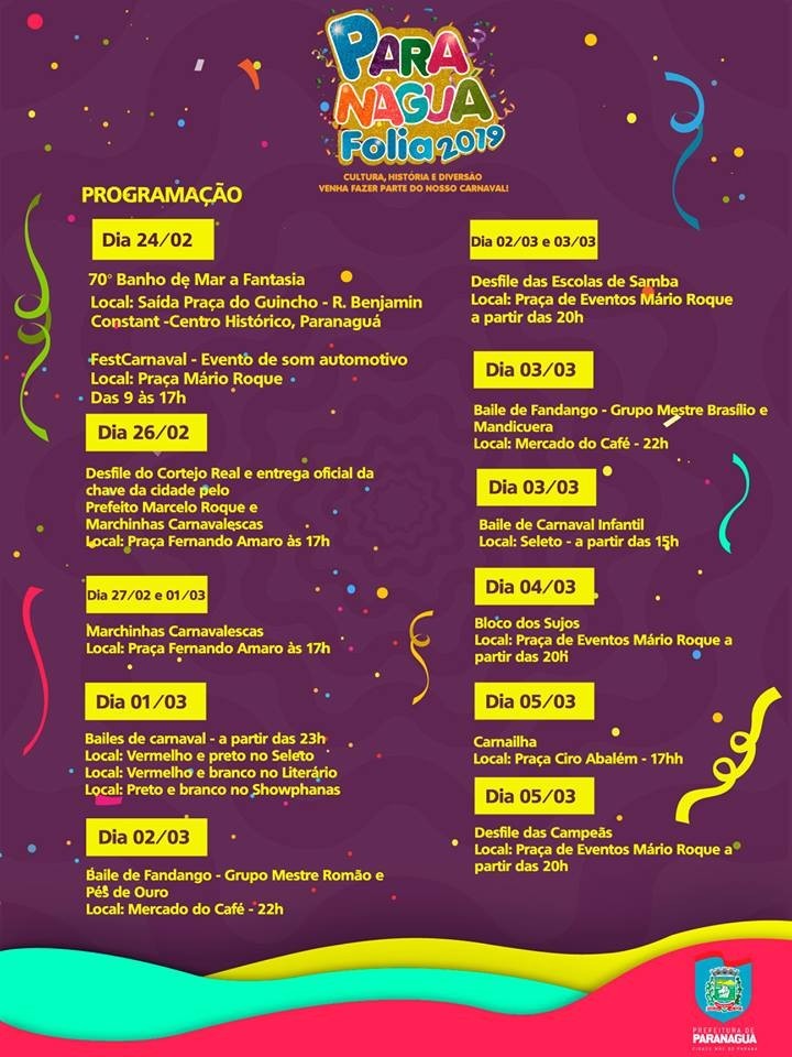 Confira a programação para o Carnaval 2019 de Paranaguá Redação Publicado há 6 anos Domingo tem Banho de Mar a Fantasia SECOM Deixe o seu comentário