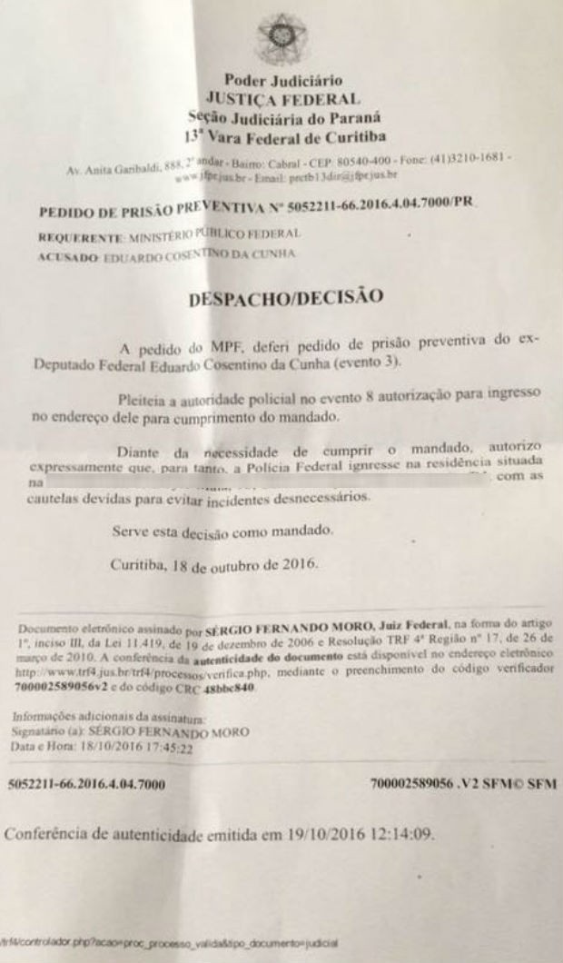 O juiz federal Sérgio Moro, responsável pela Operação Lava Jato na primeira instância da Justiça, determinou na terça-feira (18) a prisão do ex-presidente da Câmara e deputado cassado Eduardo Cunha (PMDB-RJ). O pedido é de previsão preventiva, ou seja por tempo indeterminado.