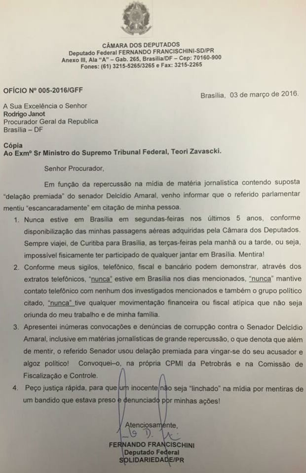Delcídio do Amaral afirmou em delação premiada que teve a informação de que o deputado federal e ex-secretário de Segurança do Paraná Fernando Francischini (SD) fazia parte de um grupo de parlamentares que pedia dinheiro para barrar requerimentos de convocação de empresário na CPI da Petrobras.
