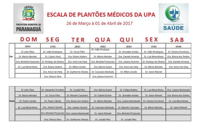 A Prefeitura de Paranaguá, por meio da Secretaria Municipal de Saúde e Prevenção (Semsap), divulga nesta segunda-feira (27) a escala de plantões médicos da UPA - Unidade de Pronto Atendimento de Paranaguá para esta semana (de 26 de março a 1.º de abril). A publicação é uma determinação do prefeito Marcelo Roque, para dar total transparência ao atendimento e também para que o cidadão parnanguara seja um fiscalizador.