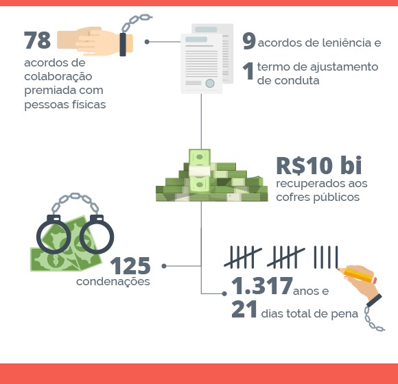 De acordo com dados do Ministério Público Federal no Paraná atualizados em fevereiro, foram 57 acusações criminais contra 260 pessoas, sendo que em 25 já houve sentença por crimes como lavagem de dinheiro, corrupção, organização criminosa e tráfico transnacional de drogas. Até agora, a Lava Jato conseguiu recuperar R$ 10 bilhões aos cofres públicos, entre valores que já foram devolvidos ou estão em processo de recuperação.