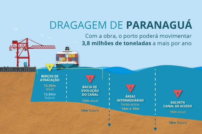 Com a nova dragagem, o canal de acesso ao Porto de Paranaguá, chamado canal da Galheta, passará a ter 16 metros de profundidade. Hoje, o canal possui 15 metros.