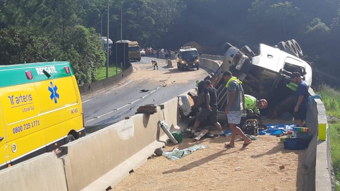 Após bater contra os dois carros, o caminhão ainda bateu na mureta de proteção da via e tombou na rodovia, parando com as rodas para cima. O motorista, que ficou preso às ferragens, foi socorrido e encaminhado em estado grave ao Serviço de Atendimento ao Usuário (SAU) da Autopista Litoral Sul – concessionária que administra o trecho.