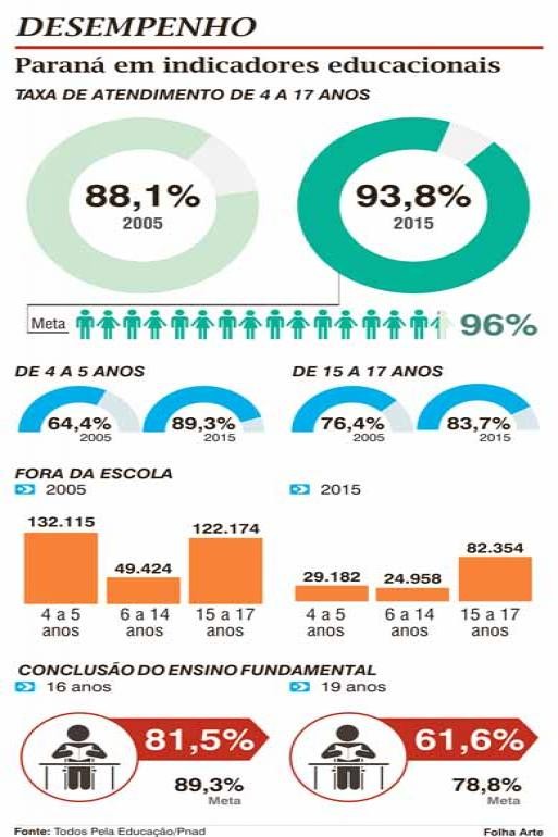 Entre 2005 e 2015, a taxa de atendimento nas escolas paranaenses passou de 88,1% para 93,8%, num total de 2.047.599 alunos, incluindo as redes estadual e municipais, no caso dos primeiros anos do ensino fundamental. Mesmo com a elevação de 5,7 pontos percentuais em uma década, o Estado ficou abaixo da meta para 2015 estipulada pelo Todos Pela Educação, de 96%. De acordo com o levantamento, apenas Tocantins (95,1%) atingiu a meta prevista para 2015, que varia para cada Estado.