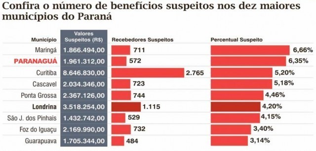 O maior percentual de recursos suspeitos no Paraná é no pequeno município de Nossa Senhora das Graças, que tem população de 3,8 mil, no Norte do Estado. O MPF detectou 34 beneficiários suspeitos, cujo montante pago a eles corresponde a 13% do valor repassado ao município. Entre as grandes cidades, Maringá tem o maior percentual de suspeitos (6,66%). Lá, 711 recebedores estão sob investigação. Na capital, 2.765 suspeitos, que receberam 5,2% do valor repassado para Curitiba.