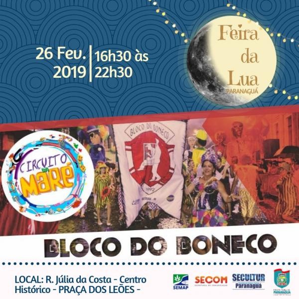 Nesta terça-feira, 26, Paranaguá recebe o Circuito da Maré que apresenta o espetáculo do Bloco dos Bonecos. O evento gratuito será realizado na Praça Eufrásio Corrêa, a “Praça dos Leões”, a partir das 19h30.
