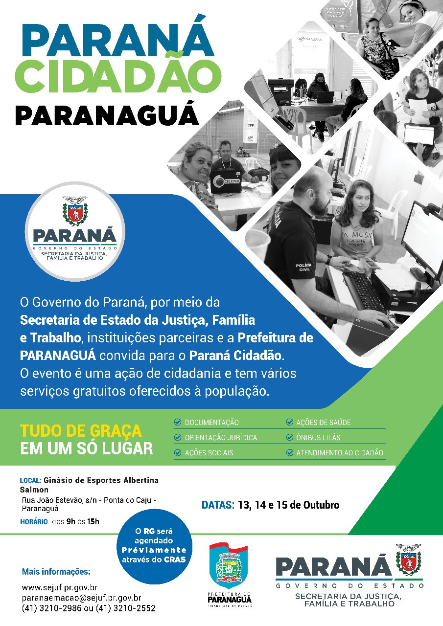 A Prefeitura de Paranaguá promove, ao lado da Secretaria Estadual da Justiça, Família e Trabalho, as ações do programa Paraná Cidadão, durante os dias 13 a 15 de outubro, na Arena Albertina Salmon. Inúmeros serviços são programados para serem ofertados das 9h às 15h. Uma feira de emprego também está inclusa no evento, ela acontece na quinta-feira, 14 de outubro, e sexta-feira, 15 de outubro.