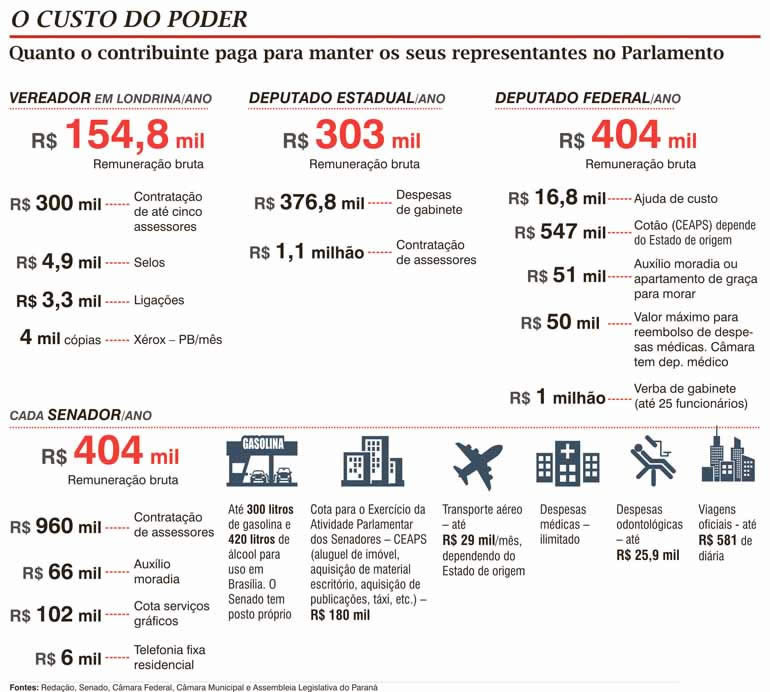 Além do poder político, os novos presidentes do Senado, Eunício de Oliveira (PMDB), e da Câmara dos Deputados, Rodrigo Maia (DEM), vão administrar orçamento de R$ 10,2 bilhões em 2017. No Paraná, o deputado estadual Ademar Traiano (PSDB), reeleito para a presidência da Assembleia Legislativa (AL), que possui 54 deputados estaduais, administra quase R$ 700 milhões, orçamento superior ao de 97% das cidades paranaenses. Já na Câmara de Londrina, o presidente Mário Takahashi (PV) terá para este ano R$ 35 milhões para manter os 19 vereadores, 54 servidores efetivos e 96 comissionados.