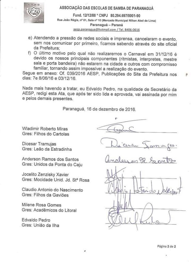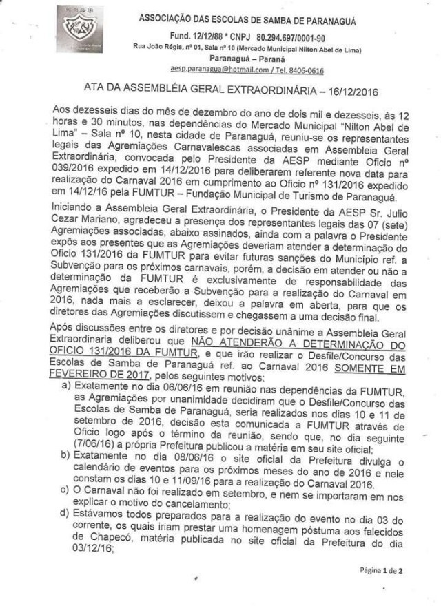 Em Assembleia Geral foi realizada hoje as 12h30as 7 (sete) escolas de samba de Paranaguá decidiram em não realizar o desfile de carnaval em 31/12/16, elas desfilarão somente em fevereiro de 2017.
