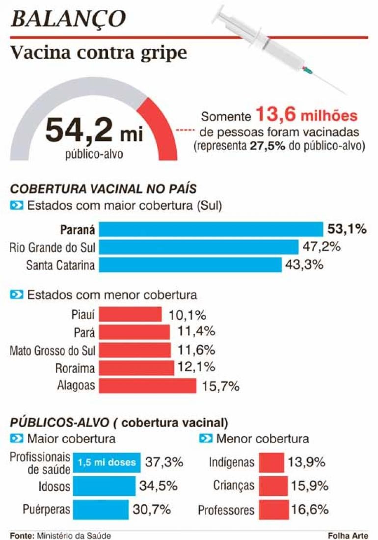 Os idosos são os que mais participaram da campanha no Paraná até agora. Mais de 782 mil ou 66% do total foram imunizados. Em todo o Brasil, menos de 35% receberam a vacina. De acordo com o Ministério da Saúde, os números mais preocupantes da campanha como um todo estão nos estados do Piauí (com apenas 10,1% da meta geral atingida), Pará (11,4%) e Mato Grosso do Sul (11,6%).