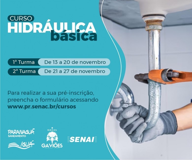Em parceria com o Senai (Serviço Nacional de Aprendizagem Industrial) e o Grêmio Recreativo Filhos da Gaviões, a Paranaguá Saneamento, empresa do grupo Iguá, irá oferecer duas turmas do curso de hidráulica básica, para alunos interessados. A capacitação oferta com 25 vagas, cada uma, e o início da segunda turma acontecerá no dia 22 de novembro, com duração de cinco dias. As inscrições são gratuitas e podem ser realizadas diretamente pelo link: https://forms.office.com/r/m0BPYtQ4TZ