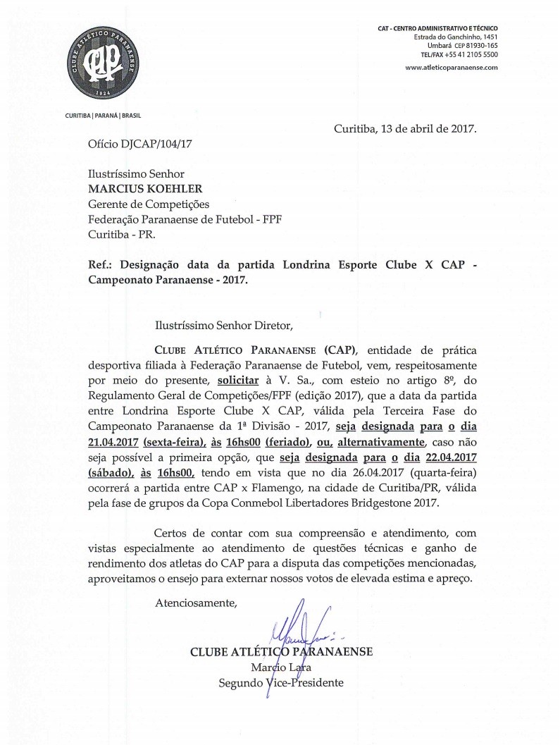 No documento, o clube utiliza como motivo o fato do compromisso contra o Flamengo, na Arena da Baixada, pela Libertadores, estar marcado para o dia 26. Ou seja, três dias após o jogo contra o Tubarão, caso aconteça no domingo (23).