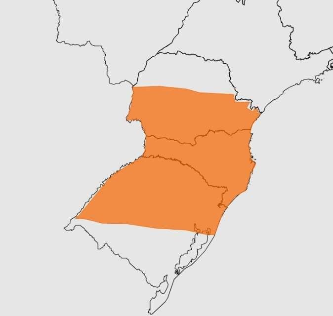 A metade sul do estado está na área de perigo para chuva volumosa e possibilidade de rajadas de ventos fortes que podem chegar a 100 km/h.