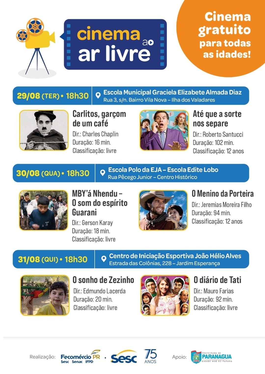 A Prefeitura de Paranaguá, por meio da Secretaria Municipal de Cultura e Turismo (Secultur), está promovendo o Cinema ao Ar Livre, em parceria com o Sesc, com o objetivo de fomentar a cultura e acessibilidade social. O projeto consiste na exibição gratuita de filmes e documentários com classificação livre em locais públicos.