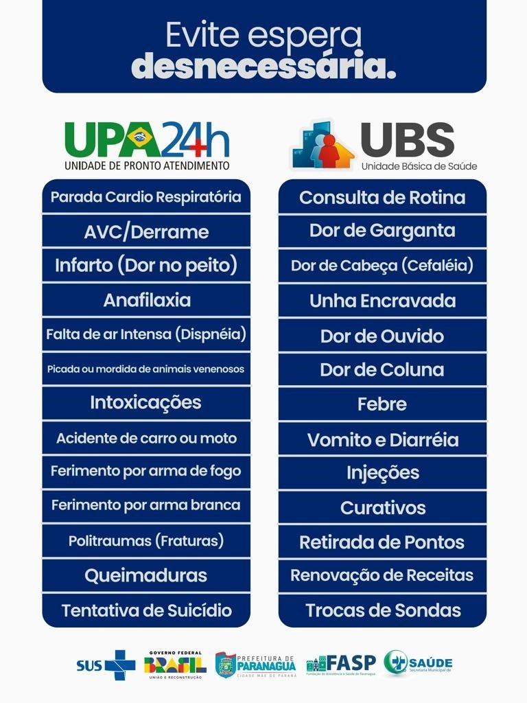 A UPA é o local para atendimento de casos como sintomas de AVC, infarto, falta de ar intensa, intoxicações, acidentes de carro ou motocicleta, parada cardiorrespiratória, fraturas, entre outras situações de urgência e emergência.