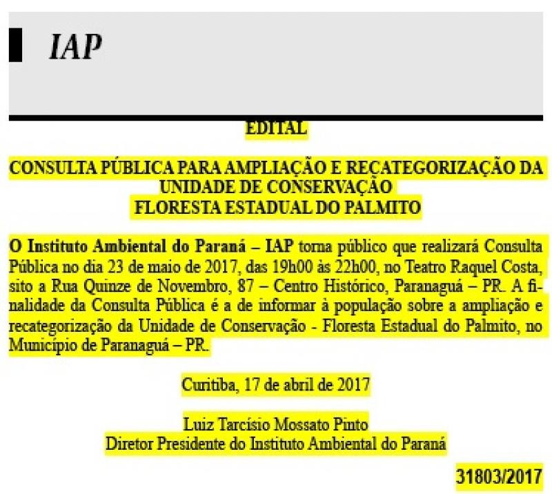 "Seguindo determinação do prefeito Marcelo Roque, estaremos presentes nesta consulta pública desta área ambiental tão importante para Paranaguá e o Paraná que é a Floresta Estadual do Palmito", afirma o secretário de Desenvolvimento Sustentável, Raphael Rolim de Moura. A referida consulta pública foi inclusive oficializada no Diário Oficial do Estado em sua edição nº 9928, na página 15, procotolo Nº 31803/2017, assinada pelo diretor-presidente do IAP, Luiz Tarcísio Mossato Pinto.