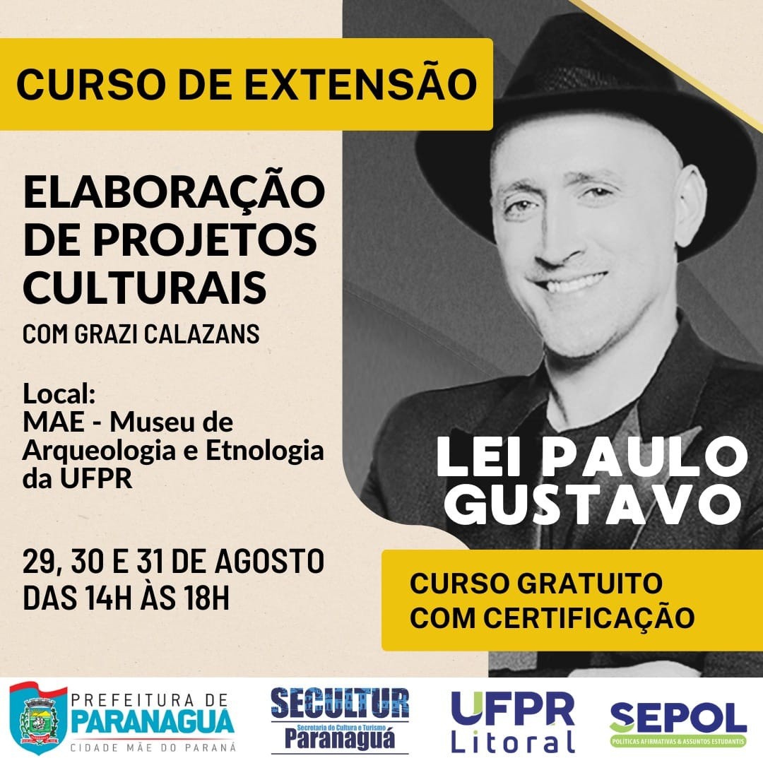 A Prefeitura de Paranaguá, por meio da Secretaria Municipal de Cultura e Turismo, (Secultur), está ofertando curso de extensão Elaboração de Projetos Culturais com foco na Lei Paulo Gustavo.