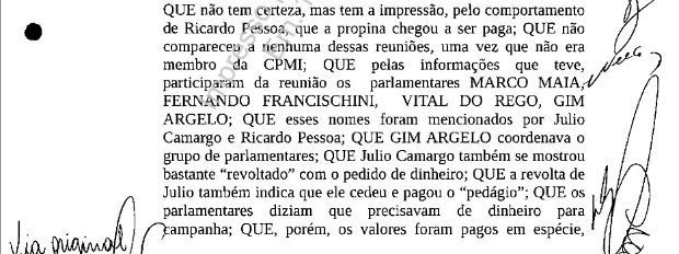 “(...) Nessas reuniões, os parlamentares pediam dinheiro para os empresários em troca da derrubada dos requerimentos; que conversou com Ricardo Pessoa sobre esse tema e o mesmo narrou ao depoente esses fatos e se mostrou 'revoltado' com o pedido de dinheiro”, diz trecho da delação.