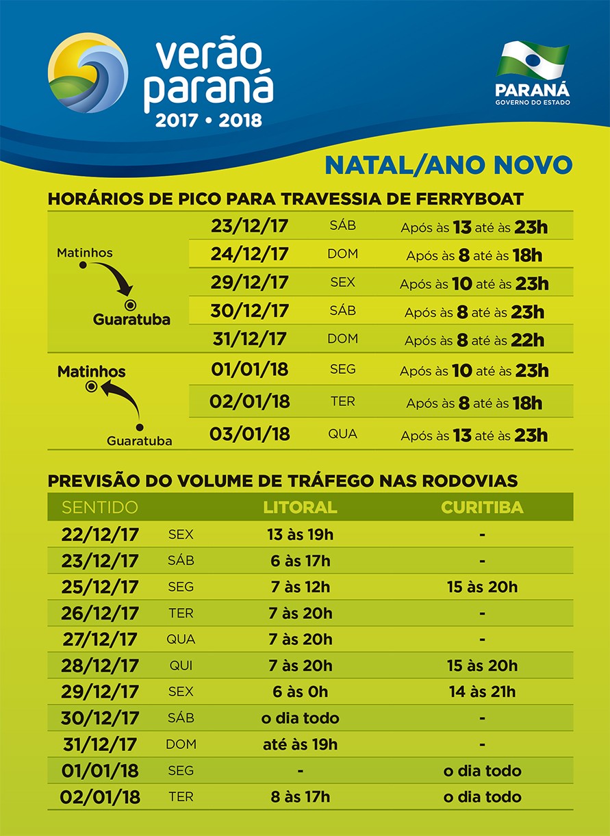 O Departamento de Estradas de Rodagem do Paraná (DER-PR) está reforçando nesta semana de véspera de Natal a divulgação dos horários de pico nas rodovias, além da travessia do ferryboat entre Matinhos e Guaratuba.