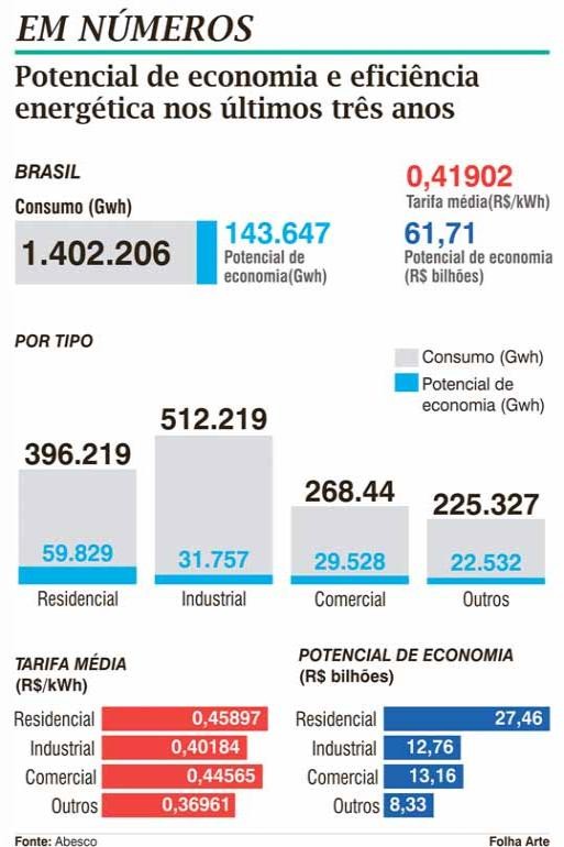 Sem tal desperdício, seria possível reduzir o uso de termelétricas em momentos de baixa nos reservatórios de usinas hidrelétricas e uma menor necessidade de investimentos na ampliação da rede, o que baratearia a tarifa. A quantidade de eletricidade que deixou de ser economizada é equivalente a 143,6 milhões de gigawatt-hora (Gwh), o que poderia abastecer por um mês uma cidade de 533 mil habitantes durante um mês, de acordo com a Abesco. O número é quase a população de Londrina, que fechou 2016 com 553 mil habitantes, segundo estimativa do IBGE (Instituto Brasileiro de Geografia e Estatística).
