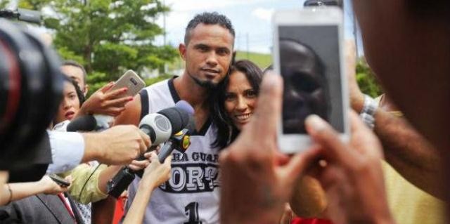 Ele chegou ao Fórum de Santa Luzia, na Grande Belo Horizonte, no início da tarde, vestindo uma camiseta da torcida organizada Galoucura, do Clube Atlético Mineiro, time que revelou Bruno. Tirou “selfies” com fãs, inclusive um homem que usava máscara de cachorro, mas não falou com os repórteres.”O Bruno acabou de sair da prisão provisória. Tem a vida toda para cuidar. É preciso ter um pouco de paciência. Ele vai falar no momento adequado”, afirmou o advogado Lúcio Adolfo, enquanto o goleiro permaneceu de cabeça baixa, com as mãos nas costas.