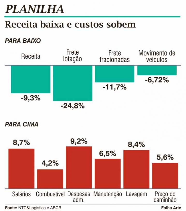 O presidente do Sindicato das Empresas de Transporte de Carga do Estado do Paraná (Setcepar), Marcos Battistella, diz que a queda é mais acentuada no segmento de cargas industriais, podendo a chegar a 50%. "Também houve redução na receita de quem transporta grãos, mas não por falta de carga e sim por excesso de caminhões", explica. Por enquanto, ele não vê nenhum sinal de retomada da atividade. "Não sei se é por ansiedade. Esperamos que a economia volte a crescer e que tenhamos volumes maiores de carga para transportar. Mas, por enquanto, nada."