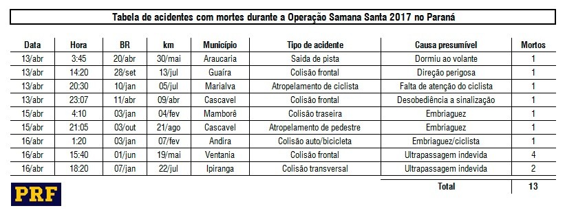 Treze pessoas morreram vítimas de acidente na Semana Santa no Paraná, de acordo com dados da operação de quatro dias da Polícia Rodoviária Federal (PRF). Foram registrados 110 pessoas feridas e 109 acidentes atendidos no estado. O total de mortes aumentou em relação ao mesmo feriado do ano passado, quando nove pessoas haviam morrido em rodovias federais do Paraná. Um aumento de 44% em relação ao ano passado. Em 2015, 15 mortes foram registradas no período.